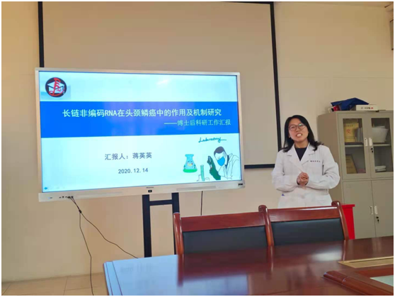 会上,蒋英英博士首先介绍了自己在上海交通大学医学院附属第九人民医院的博士后工作经历,以“长链非编码RNA在头颈鳞癌中的作用及机制研究”为题详述了在站期间的科研进展、学术成果及未来拟开展的研究方向。汇报主要讲述了长链非编码RNA在头颈鳞癌中的主要作用机制,回顾了既往热点研究和前沿进展;以自己重点研究的三个长链非编码RNA为例详细介绍了长链非编码RNA对于头颈鳞癌的研究思路及实验设计,以及长链非编码RNA的研究方向和前景发展。