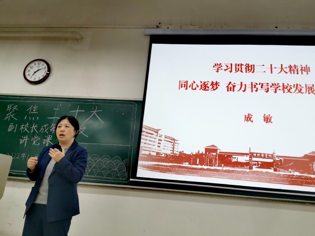 成敏围绕“学习贯彻党的二十大精神,同心逐梦,奋力书写学校发展新华章”这一主题,从四个方面梳理党的二十大要点,提纲挈领地解读大会主题、政治成果与重大意义,图文并茂地介绍过去五年和新时代十年的伟大变革,条分缕析地阐述实现中华民族伟大复兴的使命任务。