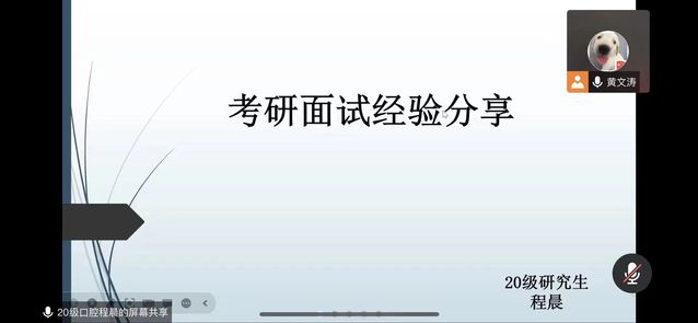 随后,三位口腔医学专业在读研究生陈曦、程晨、孟鑫首先进行了考研面试经验的分享。她们从备考初试、复试过程,个人心态调整,择师、择校原则等多个方面进行了详细的阐述,强调用英语自我介绍和回答问题时要流利,表现大方得体,要充分展现自身的实力和优势。他们还着重讲解了考研面试和求职面试的实用小技巧。在服装穿着方面,最好穿正装来表明对面试的重视程度,女生尽量淡妆不染发,男生发型清爽;在自我介绍方面,要语言精炼、条理清晰、特色鲜明、实事求是,也可在其中加入家庭情况、自身性格心态及社会兼职志愿者经历等介绍进行完善,可提前准备中英文两版进行背诵,争取在一到两分钟内展现出最精华的部分。除此之外三位同学也带来了一些常见问题及较优回答,如在学位种类选择时,若选择科研学位,则要再次熟悉做过的科研培训过程及结果、其中存在的局限性与今后打算,若选择专业学位,则可以对在场老师进行诱导式提问,回答准备充分的答案,同时不否认科研的重要性;在突然进行的英文提问或晦涩问题上,未听懂时最好使用尊敬亲切的口气进行礼貌询问,也可向老师坦白自身的不足,保持从容淡定的良好心态,把握好面试节奏。
