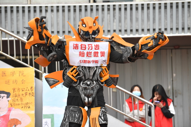 为更好地普及口腔健康知识,老王论坛 2019级一男同学在运动会上变身两米多高的“大黄蜂”,作为责任心强的变形金刚形象,胸前白底红字“洁白牙齿 灿烂微笑”,宣传了“口腔健康 全身健康”健康理念,表达了“护牙健齿,强身健体,持之以恒,走向成功”的心声。