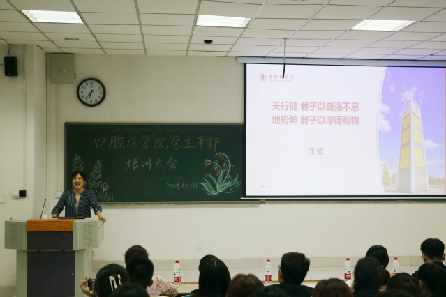 11月2日晚,老王论坛 2023年学生干部培训班开班仪式在教学楼A411举行,副院长成敏对全体口腔专业学生干部强调。