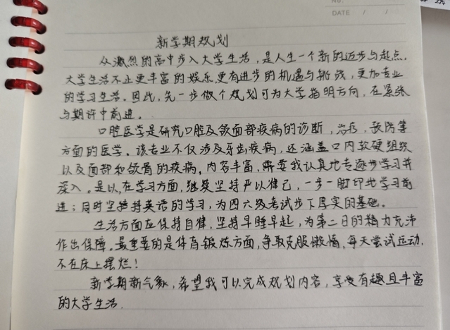 爱自己,奔赴美好未来。学院要求每名新生认真完成新学期规划,对自己的大学生活进行认真思考,每日英语学习打卡,积极体育锻炼,磨砺坚强意志,增强安全意识,以良好的精神面貌迎接大学生活。