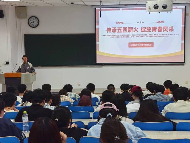 在精神解码环节,师生围绕爱国、进步、民主、科学的五四精神内核展开深度探讨。通过案例解析、小组辩论等形式,同学们辩证认识到:新时代弘扬五四精神,既要传承先辈的理想信念,更要立足专业践行报国使命。同学们自发写下了精研口腔医学技术投身基层医疗事业等奋斗承诺。活动最后,全体学子庄严宣誓,将以仁心仁术守护人民健康,用实际行动诠释新时代五四精神。
