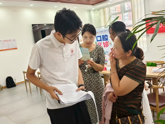 随着志愿团队搭建起义诊台,虎山镇韩家营子村养老服务中心一改往日平静变得热闹起来,周边的村民皆闻讯赶来,井然有序的排起了免费的“专家号”。附属医院专家们为村民提供细致的口腔健康检查,耐心答疑,给予基本的治疗及个性化建议。学生队员根据分工现场开展多项志愿服务,健康宣教组队员现场发放口腔健康知识手册并对相关口腔健康知识进行科普讲解,同时为居民准备了口腔护理包,引导居民正确护理口腔健康,养成良好的口腔保健习惯。基本医疗服务组队员经过前期的培训,对现场居民开展量血压、量血糖服务,并给与基本的饮食和生活建议,更好的助力基层居民健康。问卷调查组队员开展当地居民口腔健康情况现场调研,通过问卷填写和个人访谈的形式,充分了解当地居民口腔健康情况以及口腔保健情况,以期为当地政府提供有效的政策建议。
