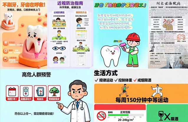 基础健康知识与常见问题系列聚焦日常健康疑惑,通过动图解说、实操视频等形式解答“为什么需要减肥”、“正确刷牙方法”等实用问题。基础疾病预防深度剖析篇则通过虚拟课堂、案例分析等方式,深入浅出地讲解疾病预防知识。针对群众普遍关心的就医问题,比赛专门设置就医流程与医保政策指南篇,通过流程图、解读文章和短视频等形式,帮助公众了解挂号、就诊、医保报销等流程。此外,健康生活方式养成篇和健康辟谣篇也从不同角度传播科学健康理念。